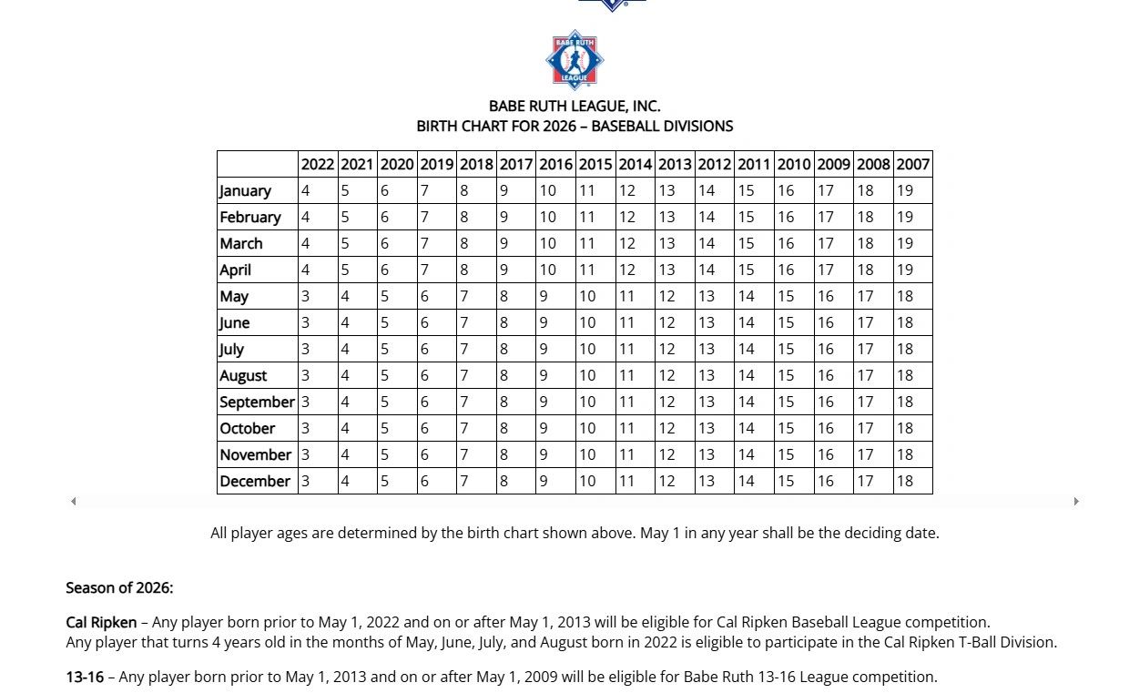 Cal Ripken – Any player born prior to May 1, 2022 and on or after May 1, 2013 will be eligible for Cal Ripken Baseball League competition.